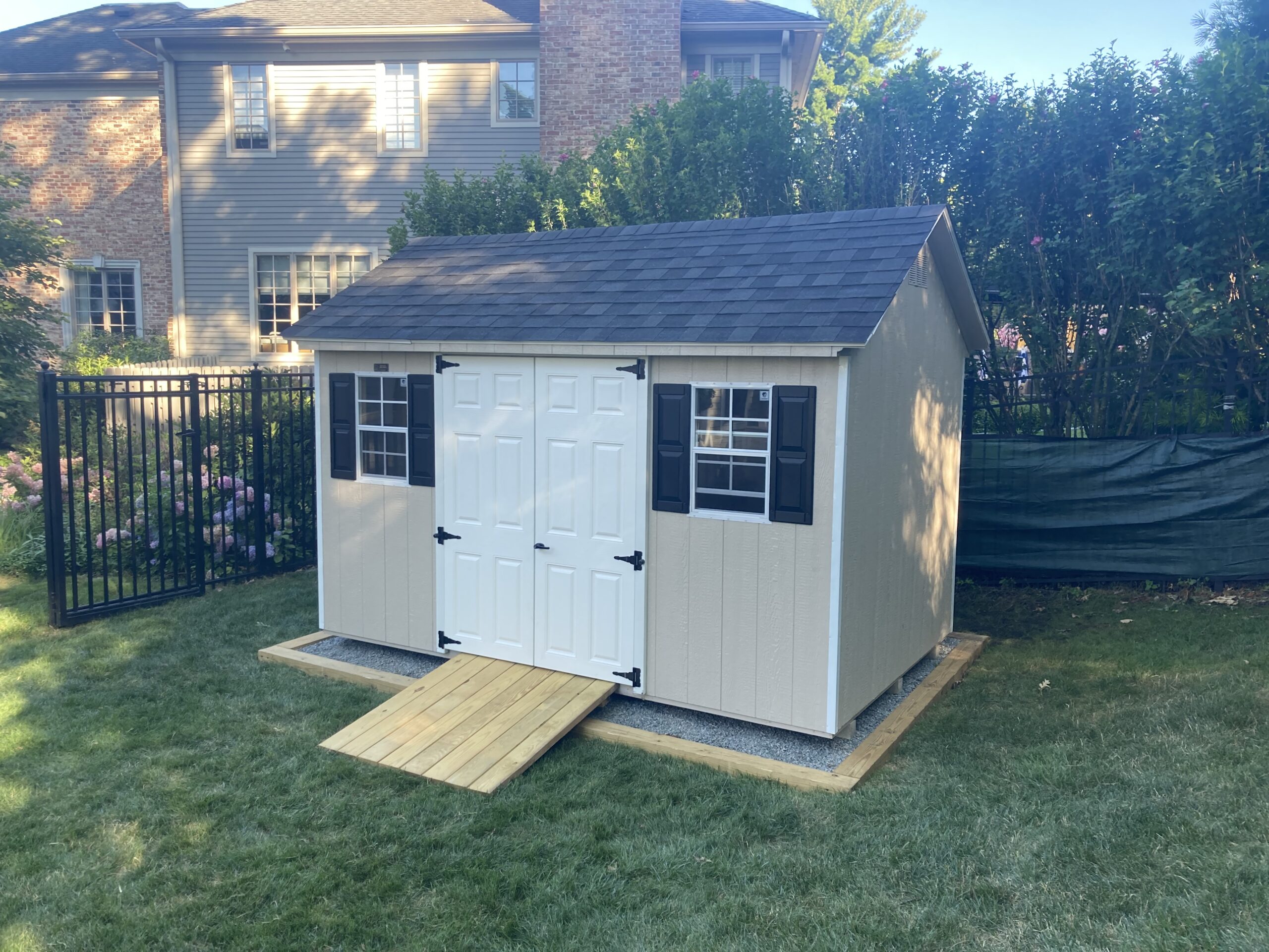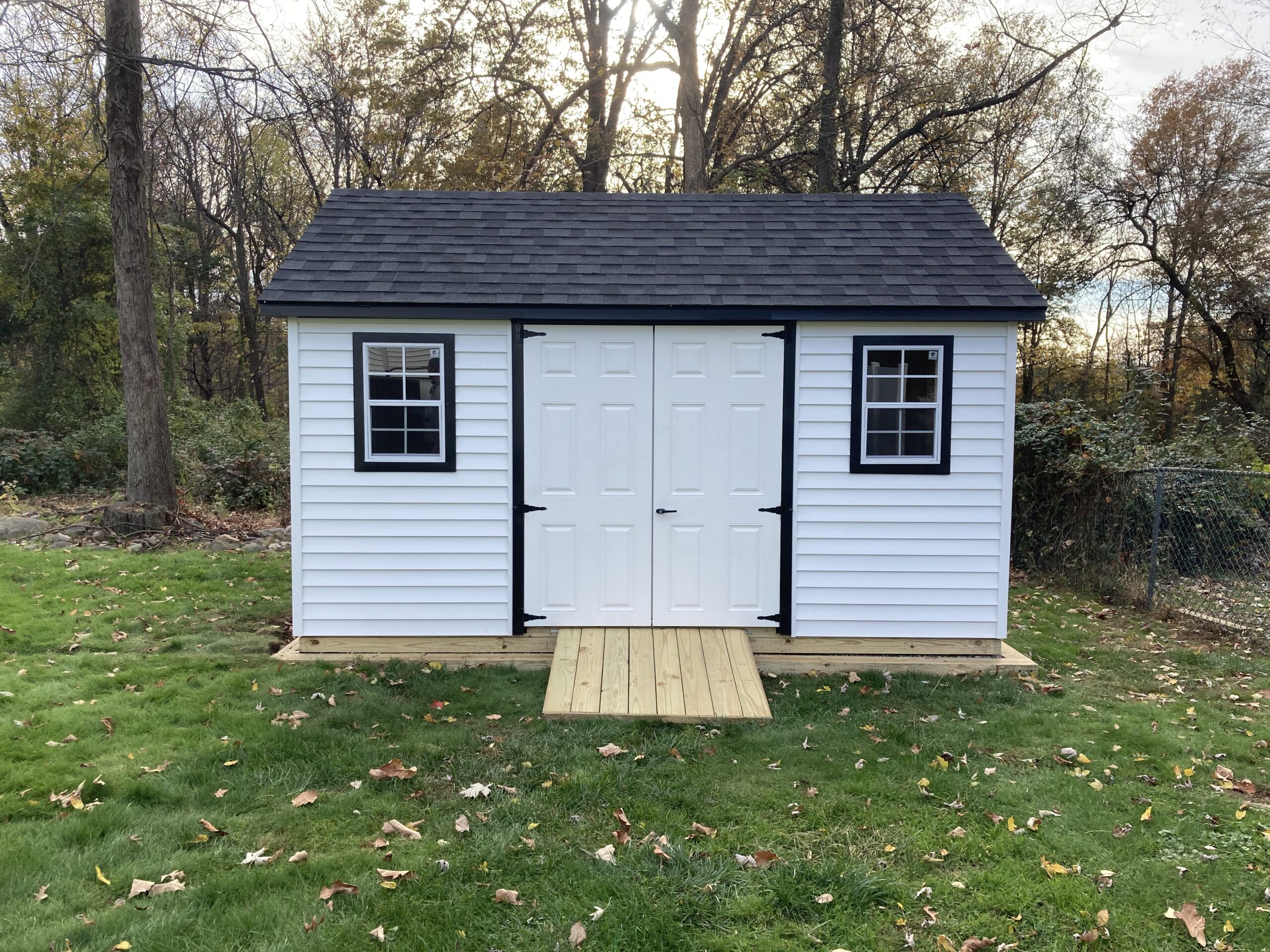 This spacious 12' x 20' shed is equipped with durable vinyl siding, upgraded windows measuring 24" wide by 36" high for enhanced lighting, and a 5' x 5' permanent ramp for easy access. Designed for both functionality and style.
